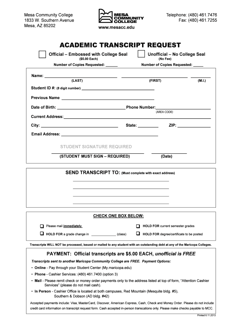 The Mesa Community College Academic Transcript Request is a document used by students to obtain official or unofficial copies of their academic transcripts.