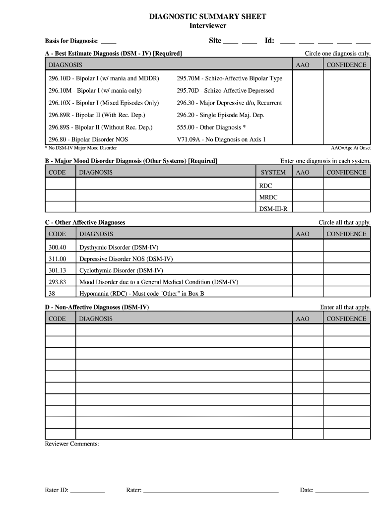 DIAGNOSTIC SUMMARY SHEET Interviewer Basis for Diagnosis: Site I'd: A — Best Estimate Diagnosis (DSM — IV) Required Circle one diagnosis only. DIAGNOSIS AAO 296.10D Bipolar I (w/ mania and DDR)