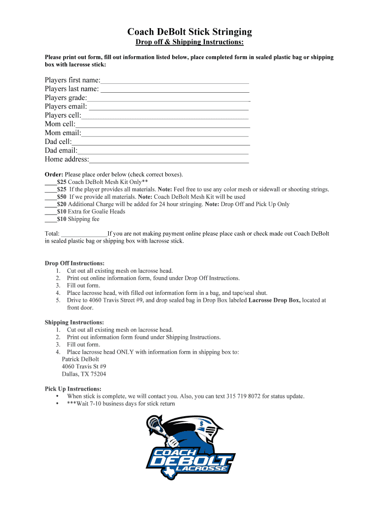 Coach Debut Stick Stringing Drop off & Shipping Instructions: Please print out form, fill out information listed below, place completed form in sealed plastic bag or shipping box with lacrosse stick:Players