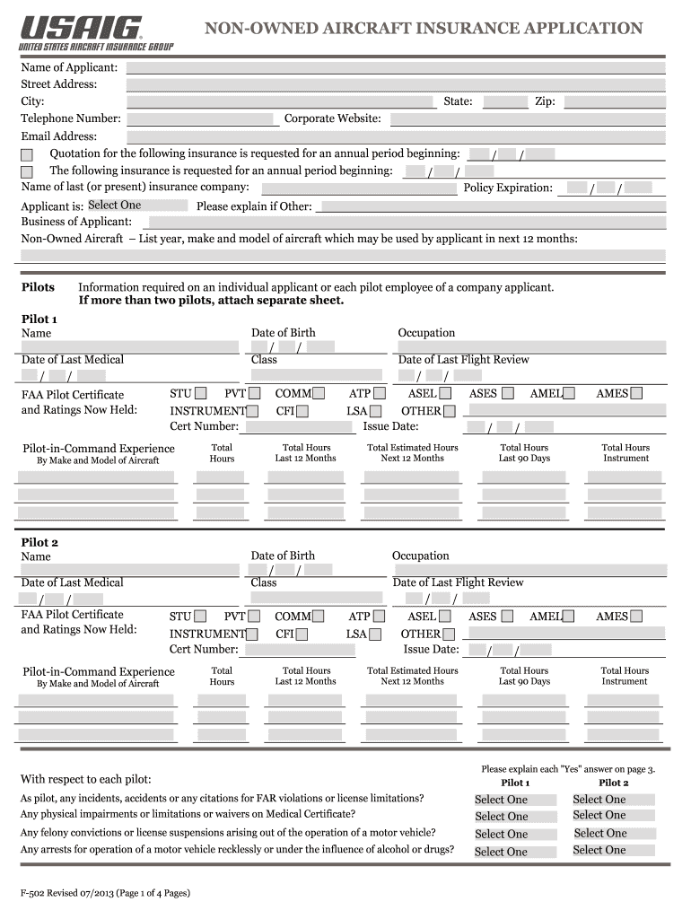 Get the free NON-OWNED AIRCRAFT INSURANCE APPLICATION - USAIG