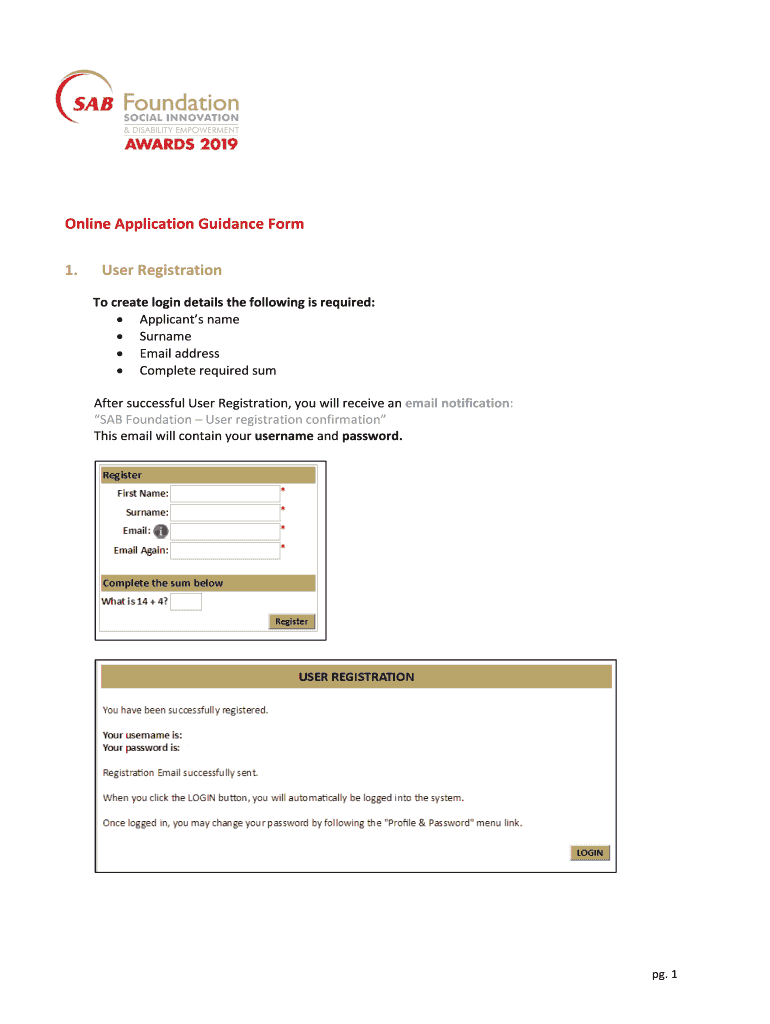 Online Application Guidance Form 1. User Registration To create login details the following is required: Applicants name Surname Email address Complete required sum After successful User Registration,