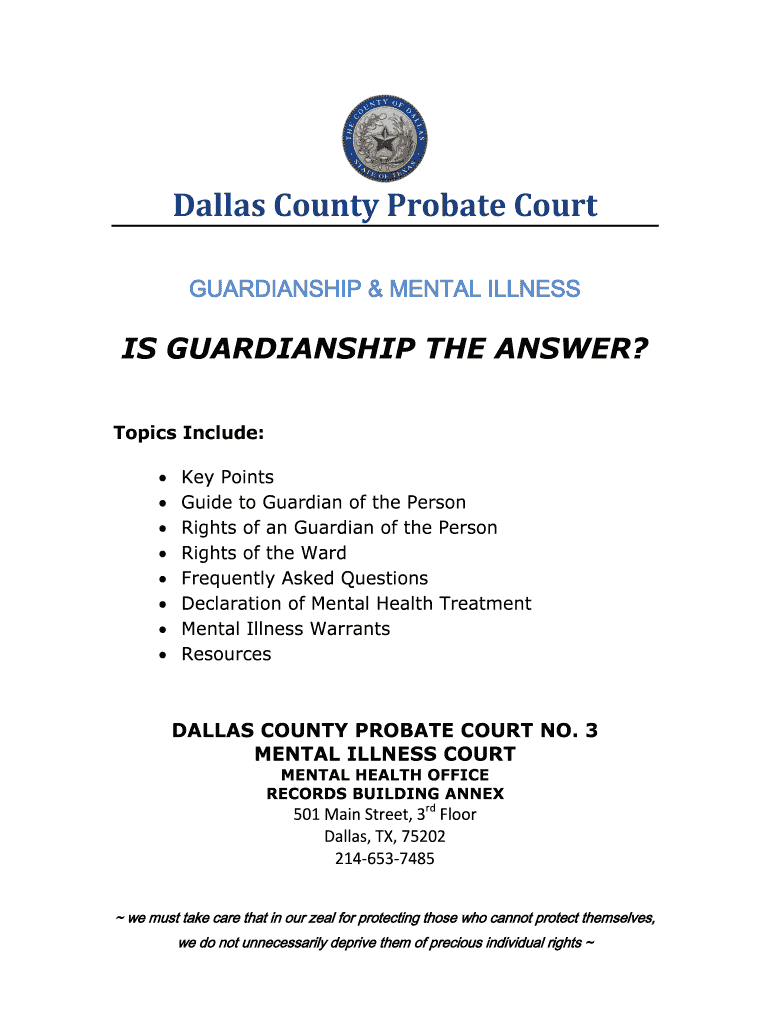 Dallas County Probate Court GUARDIANSHIP & MENTAL ILLNESS IS GUARDIANSHIP THE ANSWER? Topics Include: Key Points Guide to Guardian of the Person Rights of a Guardian of the Person Rights of the Ward