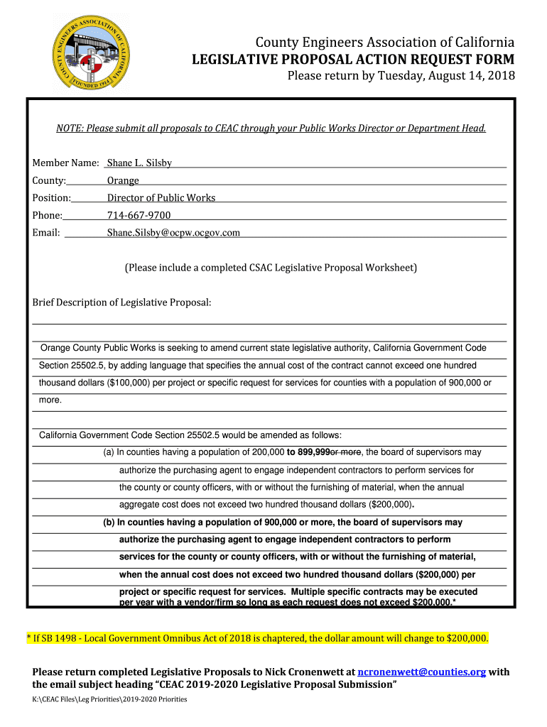 LEGISLATIVE PROPOSAL ACTION REQUEST Formulas return by Tuesday, August 14, 2018NOTE: Please submit all proposals to CAC through your Public Works Director