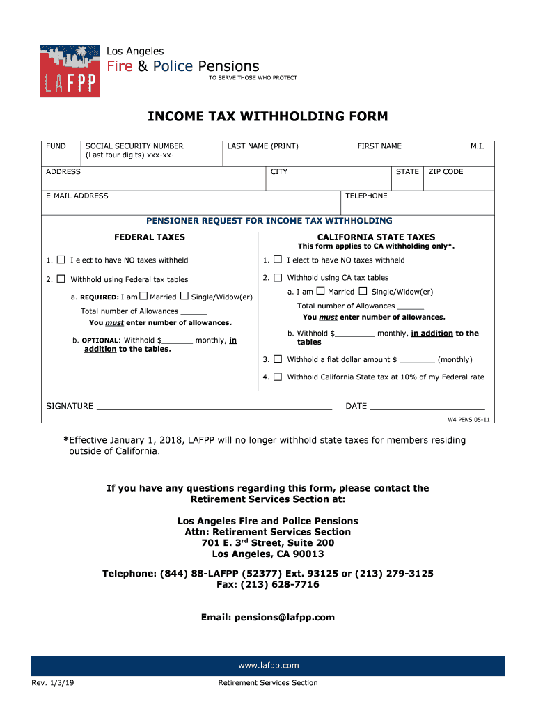 Los AngelesFire & Police Pensions TO SERVE THOSE WHO PROTECTINCOME TAX WITHHOLDING FORM UNSOCIAL SECURITY NUMBER (Last four digits) xxxxxLAST NAME (PRINT)ADDRESSFIRST NAMECITYSTATEEMAIL ADDRESS. I.