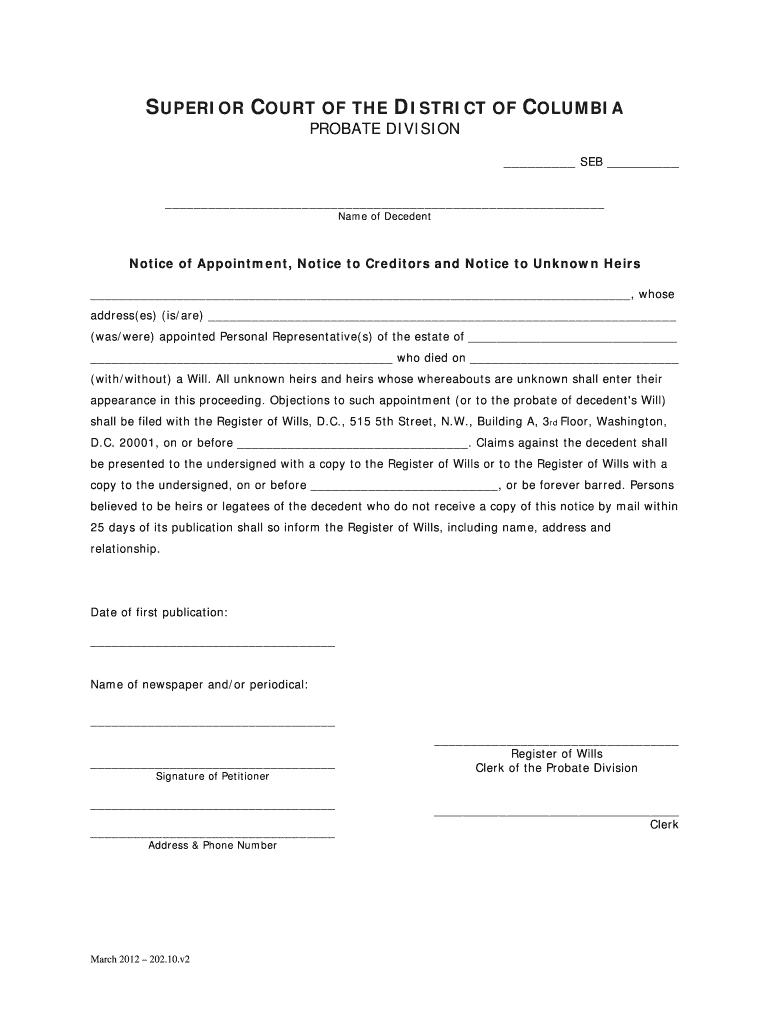 Get the free Notice of Appointment, Notice to Creditors and Notice to Unknown Heirs - dccourts