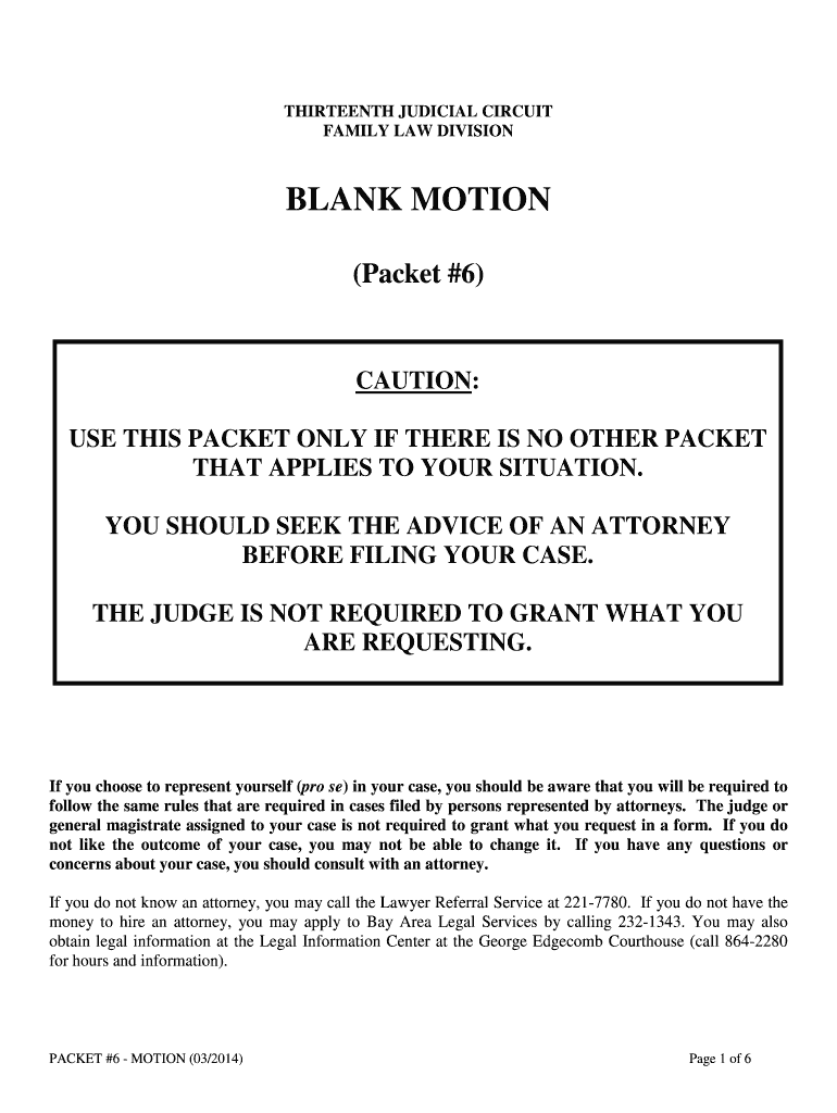 The Florida Family Law Motion Packet is designed for self-represented litigants in the Thirteenth Judicial Circuit who are filing motions related to family law cases.