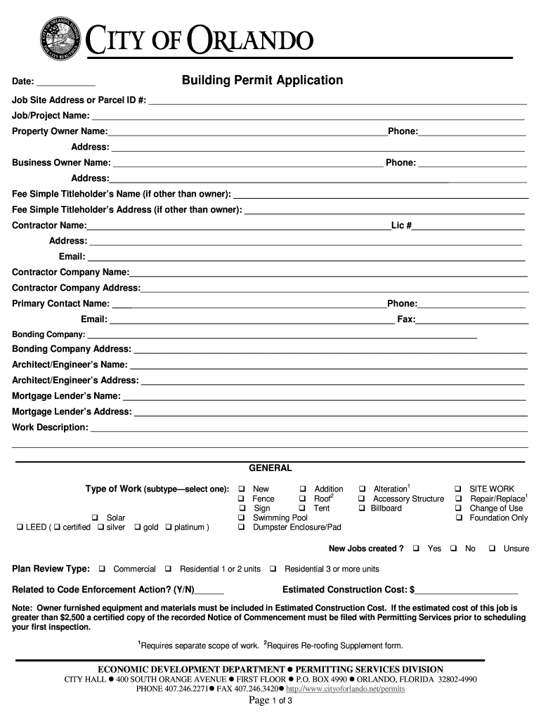 The Building Permit Application is a government form used by property owners and contractors to obtain necessary permits for construction or renovation projects in Orlando, Florida.