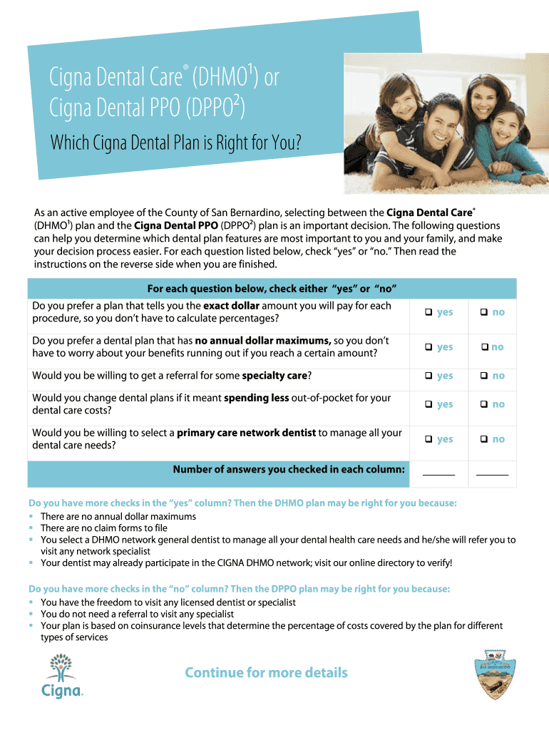 The Cigna Dental Plan Comparison Guide is specifically designed for employees of the County of San Bernardino. This guide assists users in selecting the right dental plan by presenting a clear overview of two primary types of plans: DHMO and DPPO. It explains the critical role of personal preferences, ensuring that employees choose the plan that best fits their dental care needs.