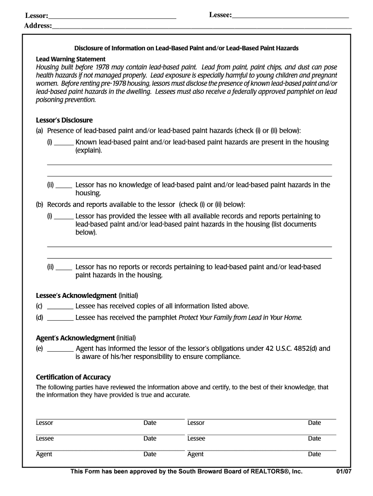 The Lead-Based Paint Disclosure Form must be signed by the lessor, lessee, and the agent involved in the transaction. Each signature confirms acknowledgment of lead hazards.