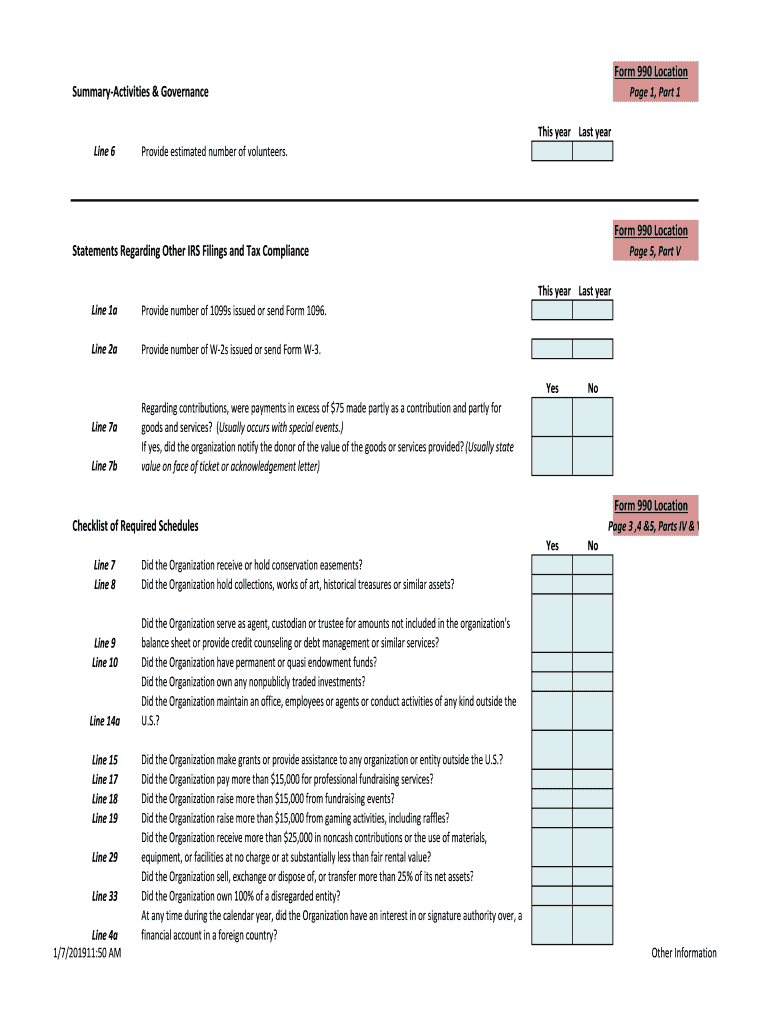 Form990Location SummaryActivities&GovernancePage1,Part1 This year LastyearLine6Provideestimatednumberofvolunteers. Form990Location StatementsRegardingOtherIRSFilingsandTaxCompliancePage5,Part This