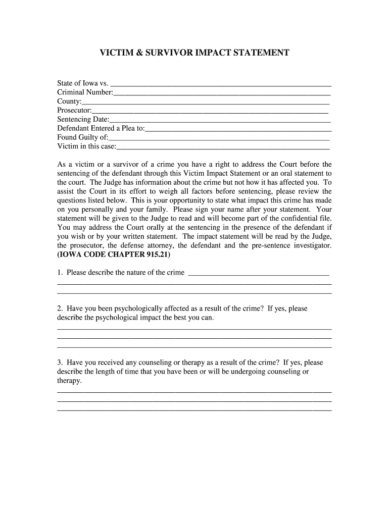 The Victim Impact Statement Form is a legal document used by victims of crime in Iowa to convey the personal impact of the crime to the court.