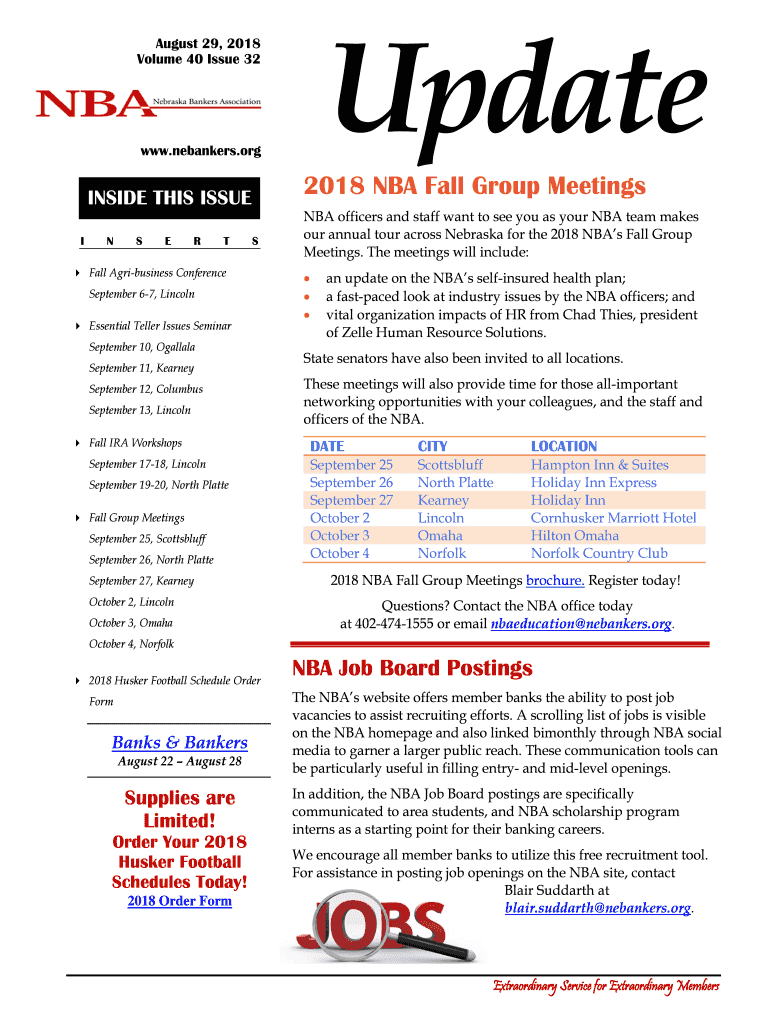 Update August 29, 2018, Volume 40 Issue 32www. Né bankers.org2018 NBA Fall Group MeetingsINSIDE THIS ISSUE INSERTS Fall Agribusiness Conference September 67, Lincoln Essential Teller Issues Seminar
