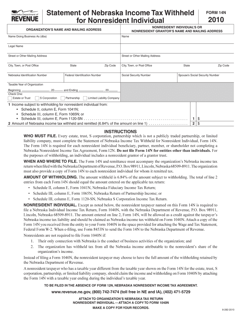 The deadline to submit the Nebraska Income Tax Withheld Form 14N typically aligns with the tax filing deadline for the applicable tax year. Ensure you check with the Nebraska Department of Revenue for specific dates.