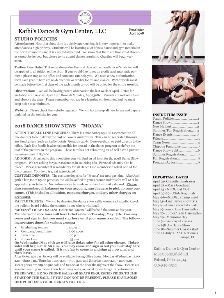 Mathis Dance & Gym Center, Newsletter April 2018STUDIO POLICIES Attendance: Now that show time is quickly approaching, it is very important to make attendance a high priority. Students will be learning