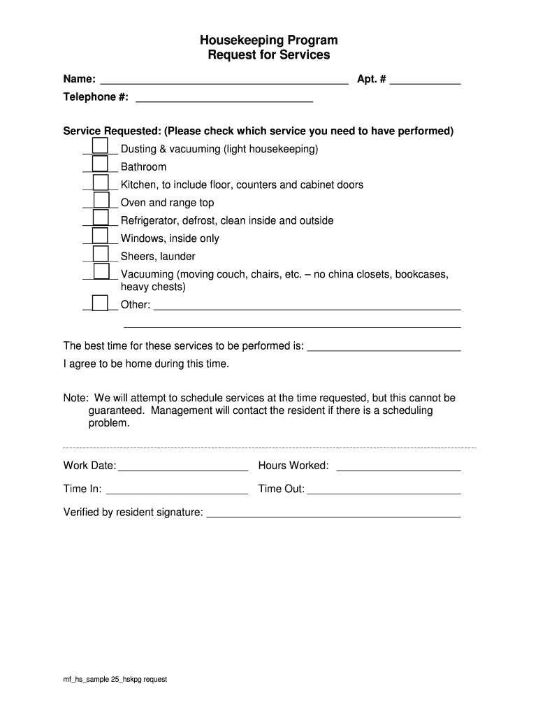 The housekeeping service request form boasts several key features designed for user-friendliness. It includes a selection of checkboxes for various services, allowing residents to indicate their preferences easily. Additionally, a dedicated signature line ensures verification of the request.