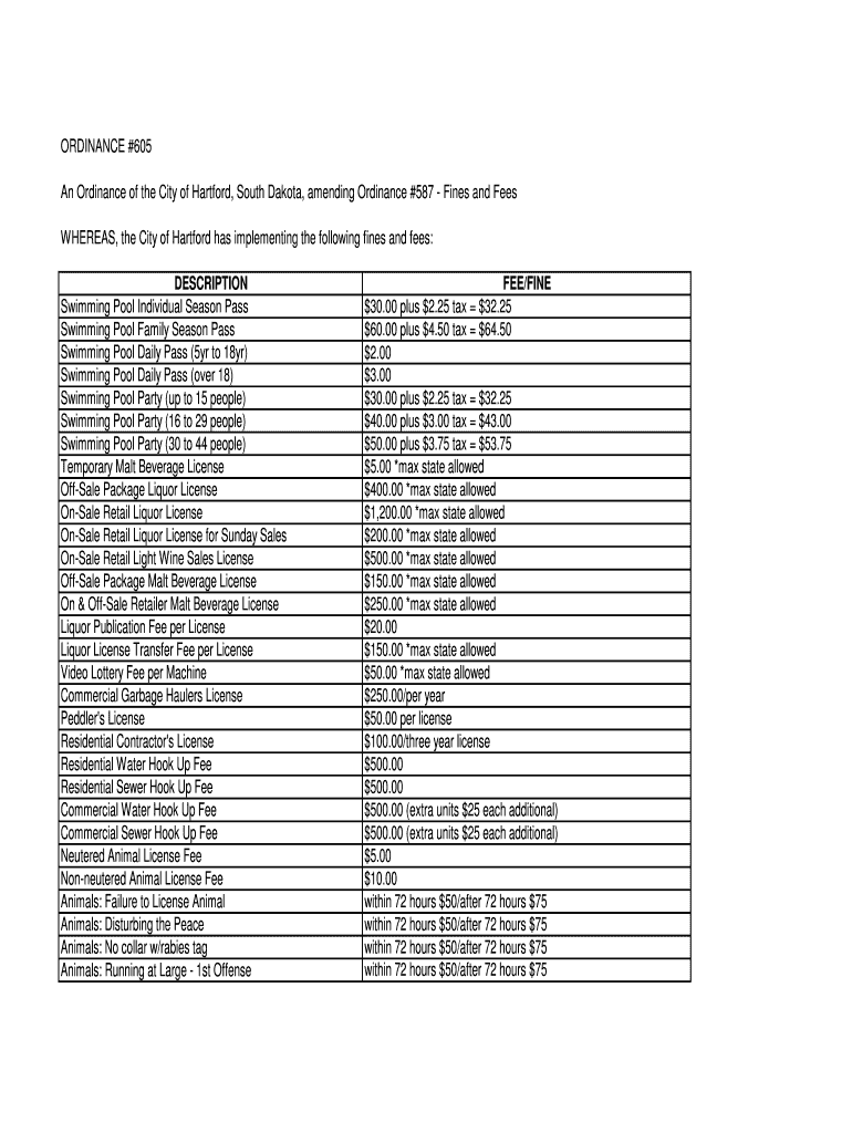 ORDINANCE #605 An Ordinance of the City of Hartford, South Dakota, amending Ordinance #587 Fines and Fees WHEREAS, the City of Hartford has implemented the following fines and fees: DESCRIPTION Swimming