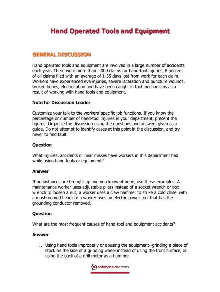 By utilizing this safety discussion guide, employers can promote a culture of safety, leading to reduced incidents and a more aware workforce. It serves as a structured approach to address potential risks associated with hand tool usage.