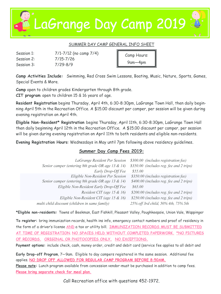 LaGrange Day Camp 2019 SUMMER DAY CAMP GENERAL INFO SHEET Session 1: Session 2: Session 3:7/17/12 (no camp 7/4) 7/157/26 7/298/9Camp Hours: 9am4pmCamp Activities Include: Swimming, Red Cross Swim