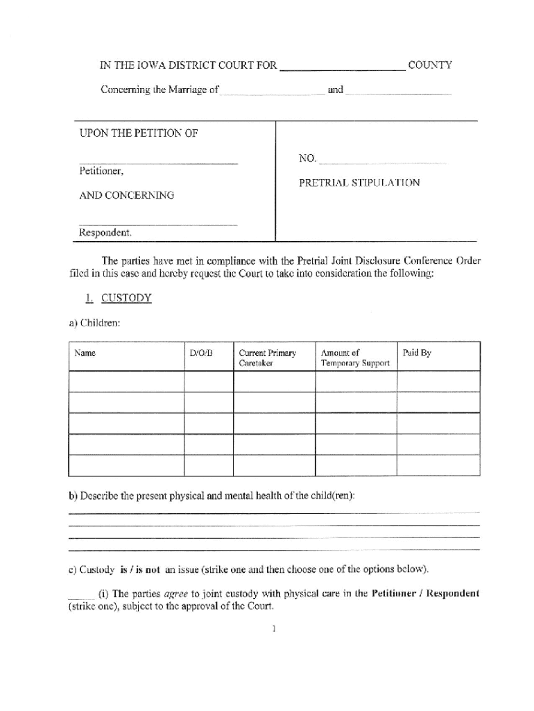 IN THE IOWA DISTRICT COURT FOR COUNTY Concerning the Marriage of and UPON THE PETITION OF Petitioner, AND CONCERNING Respondent. The parties have met in compliance with the Pretrial Joint Disclosure