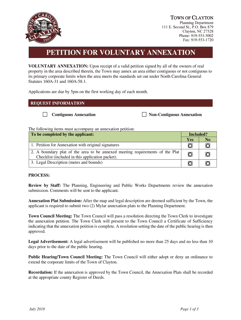 Fax: 9195531720PETITION FOR VOLUNTARY ANNEXATION: Upon receipt of a valid petition signed by