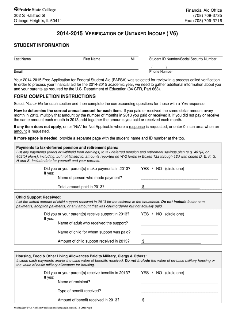 Financial Aid Office (708) 7093735 Fax: (708) 7093716 202 S. Halsted St. Chicago Heights, IL 60411 20142015 VERIFICATION OF UNTAMED INCOME (V6) STUDENT INFORMATION Last Name First Name MI Student