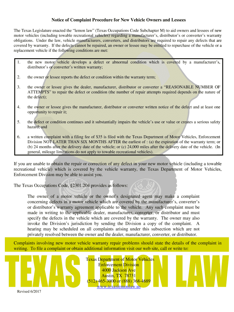 Get the free Notice of Complaint Procedure for New Vehicle Owners and ...