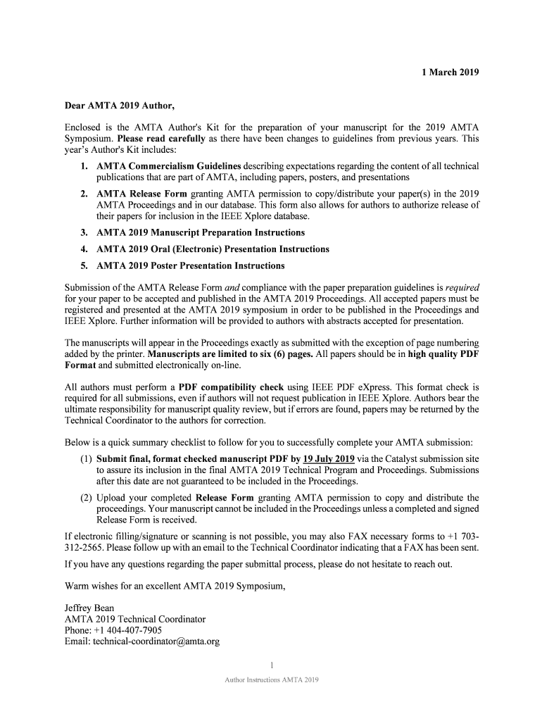Enclosed is the MTA Author\'s Kit for the preparation of your manuscript for the 2019 MTA