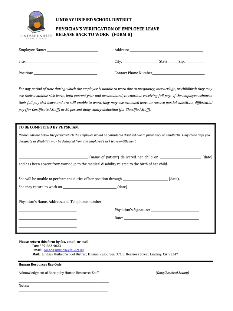 LINDSAY UNIFIED SCHOOL DISTRICT PHYSICIANS VERIFICATION OF EMPLOYEE LEAVE RELEASE BACK TO WORK (FORM B) Employee Name: Address: Site: City: State: Zip: Position: Contact Phone Number For any period