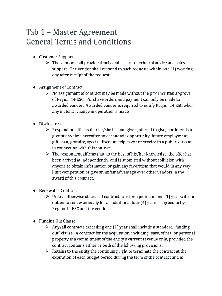 Tab 1 Master Agreement General Terms and Conditions Customer Support The vendor shall provide timely and accurate technical advice and sales support. The vendor shall respond to such requests within