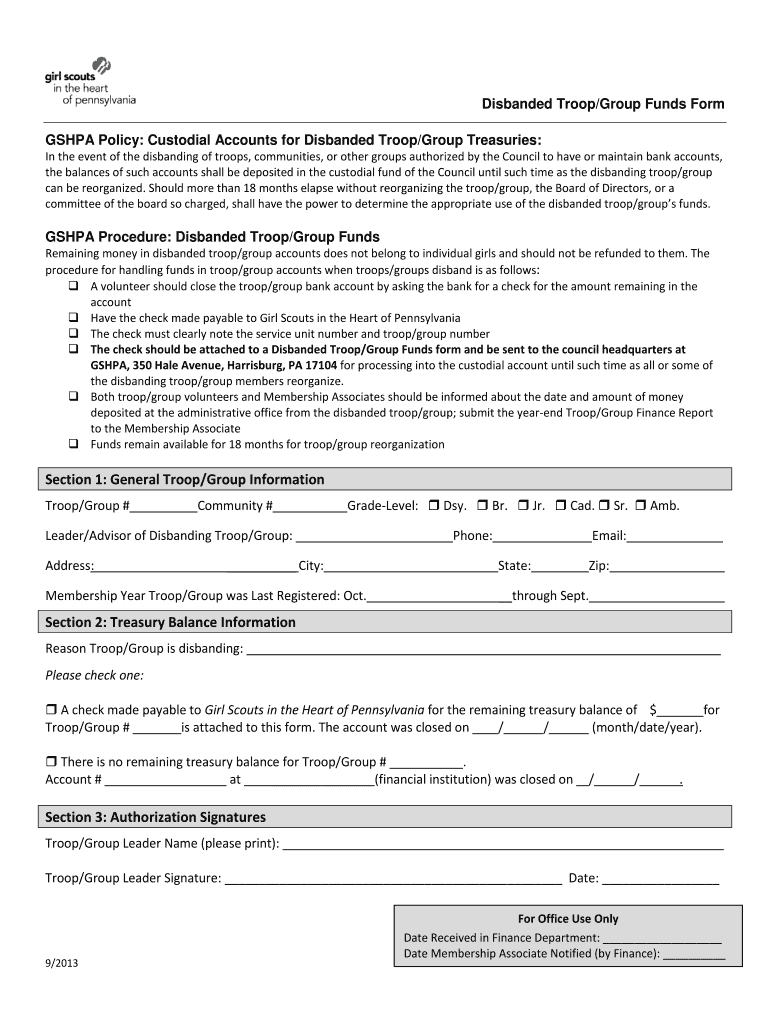 Disbanded Troop/Group Funds Form GS HPA Policy: Custodial Accounts for Disbanded Troop/Group Treasuries: In the event of the disbanding of troops, communities, or other groups authorized by the Council