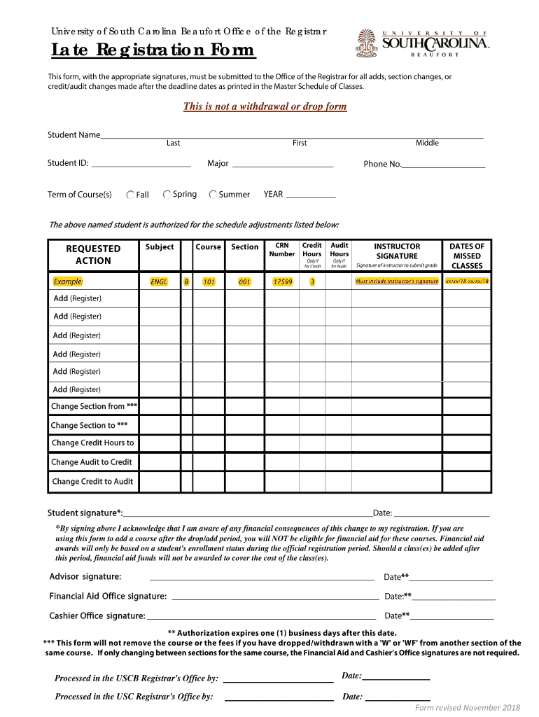 Late Registration Form PLEASE READ BEFORE COMPLETING THIS FORM All signatures are required and must be obtained in the following order. 1. Instructor(s) signature with the dates of missed classes