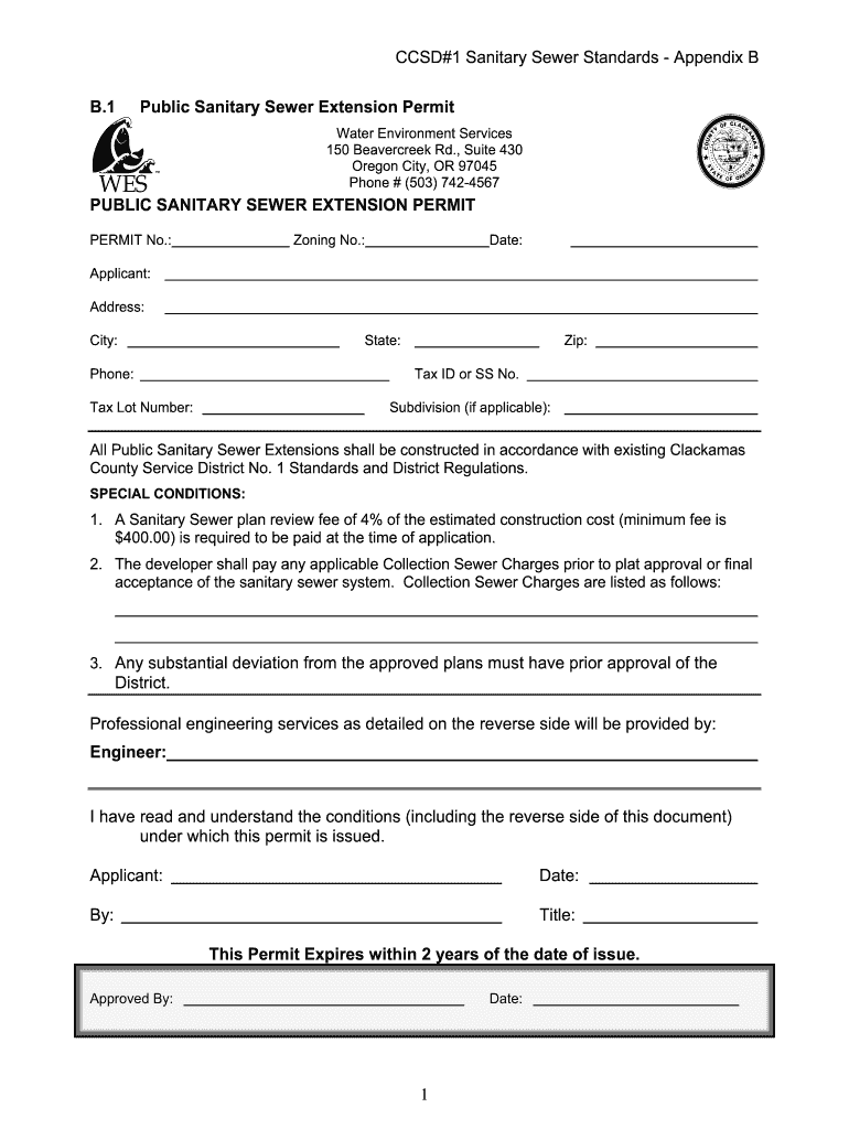 CCD×1 Sanitary Sewer Standards Appendix B.1Public Sanitary Sewer Extension Permit Water Environment Services 150 Beavercreek Rd., Suite 430 Oregon City, OR 97045 Phone # (503) 7424567PUBLIC SANITARY