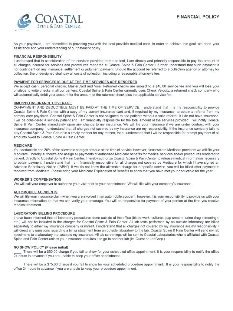 Coastal Spine & Pain Center Financial Policy 2015-2026 free printable template