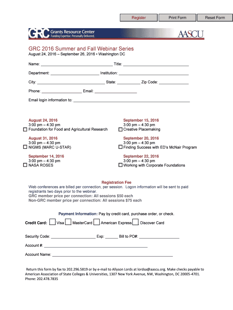 Registering Form GRC 2016 Summer and Fall Webinar Series August 24, 2016, September 26, 2016, Washington CNAME: Title: Department: Institution: City: State: Zip Code: Phone: Email: Email login information