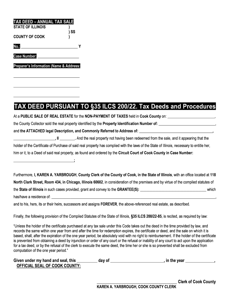 TAX DEED ANNUAL TAX SALE STATE OF ILLINOIS COUNTY OF COOK)) SS)No.: Y Case Number: Preparers Information (Name & Address: TAX DEED PURSUANT TO 35 ILLS 200/22. Tax Deeds and Procedures At a PUBLIC