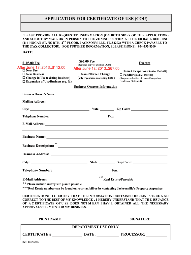 Get the free APPLICATION FOR CERTIFICATE OF USE (COU) - Jacksonville