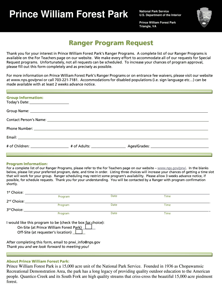 The form is primarily intended for educators, community groups, parents, and organizations wishing to request ranger-led programs at Prince William Forest Park.