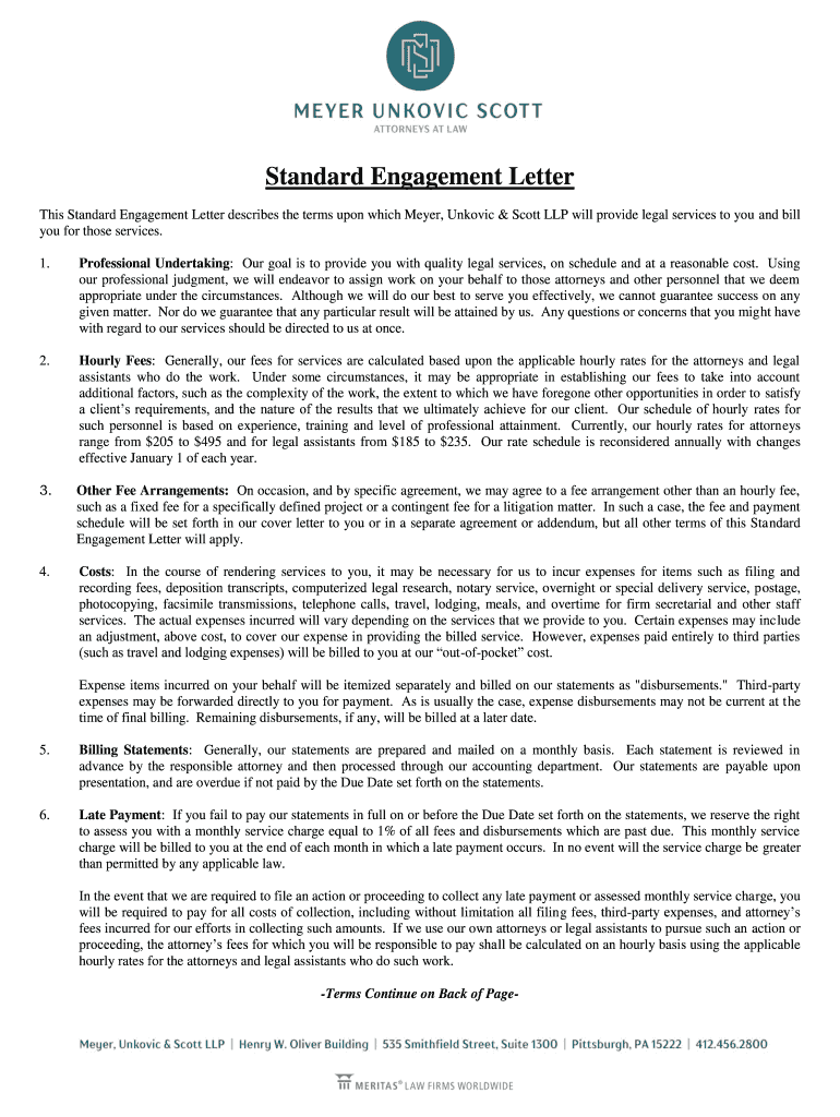 Standard Engagement Letter This Standard Engagement Letter describes the terms upon which Meyer, Novice & Scott LLP will provide legal services to you and bill you for those services. 1. Professional