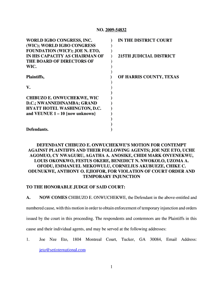 NO. 200954832 WORLD IBO CONGRESS, INC. (WIC); WORLD IBO CONGRESS FOUNDATION (WICK); JOE N. TO, IN HIS CAPACITY AS CHAIRMAN OF THE BOARD OF DIRECTORS OF WIC. Plaintiffs, V. CHICAGO E. ONWUCHEKWE, WIC