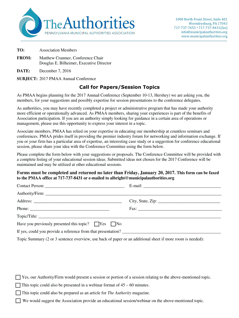 1000 North Front Street, Suite 401 Wormleysburg, PA 17043 7177377655 7177378431(fax) info municipal authorities.org www.municipalauthorities.orgTO:Association MembersFROM:Matthew Cranmer, Conference
