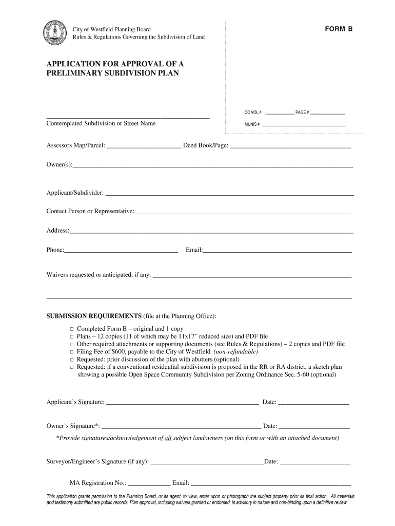 FORM City of Westfield Planning Board Rules & Regulations Governing the Subdivision of LandAPPLICATION FOR APPROVAL OF A PRELIMINARY SUBDIVISION PLAN CC VOL #PAGE #TUNIS #Contemplated Subdivision