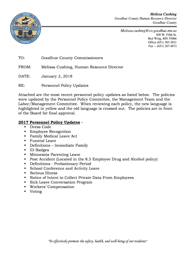 Melissa Cushing Good hue County Human Resource Director Good hue County Melissa. Cushing co. Good hue.MN.us 509 W. Fifth St. Red Wing, MN 55066 Office (651) 385.3031 Fax (651) 267.4872TO:Good hue