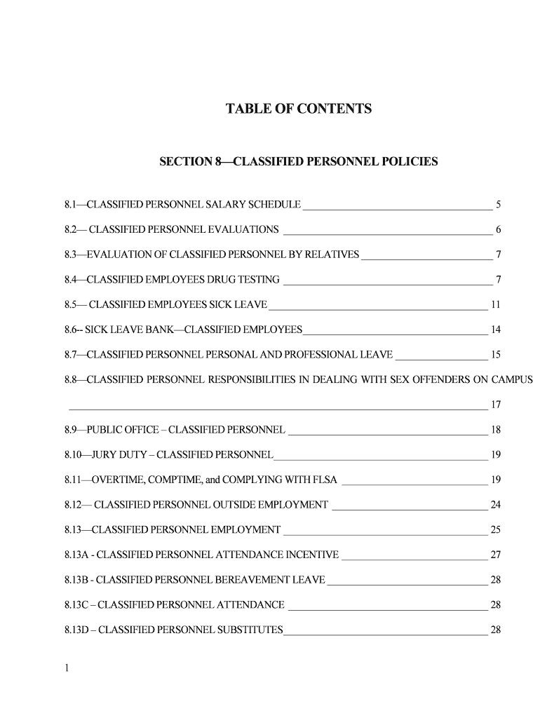 TABLE OF CONTENTSSECTION 8CLASSIFIED PERSONNEL POLICIES 8.1CLASSIFIED PERSONNEL SALARY SCHEDULE 5 8.2 CLASSIFIED PERSONNEL EVALUATIONS 6 8.3EVALUATION OF CLASSIFIED PERSONNEL BY RELATIVES 7 8.4CLASSIFIED