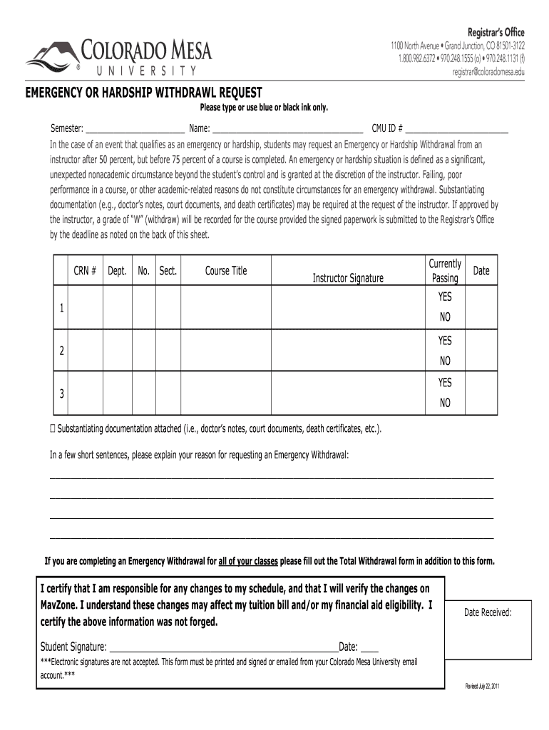 EMERGENCY OR HARDSHIP WITHDRAWAL REQUEST Please type or use blue or black ink only. Semester: Name: CMU ID # In the case of an event that qualifies as an emergency or hardship, students may request