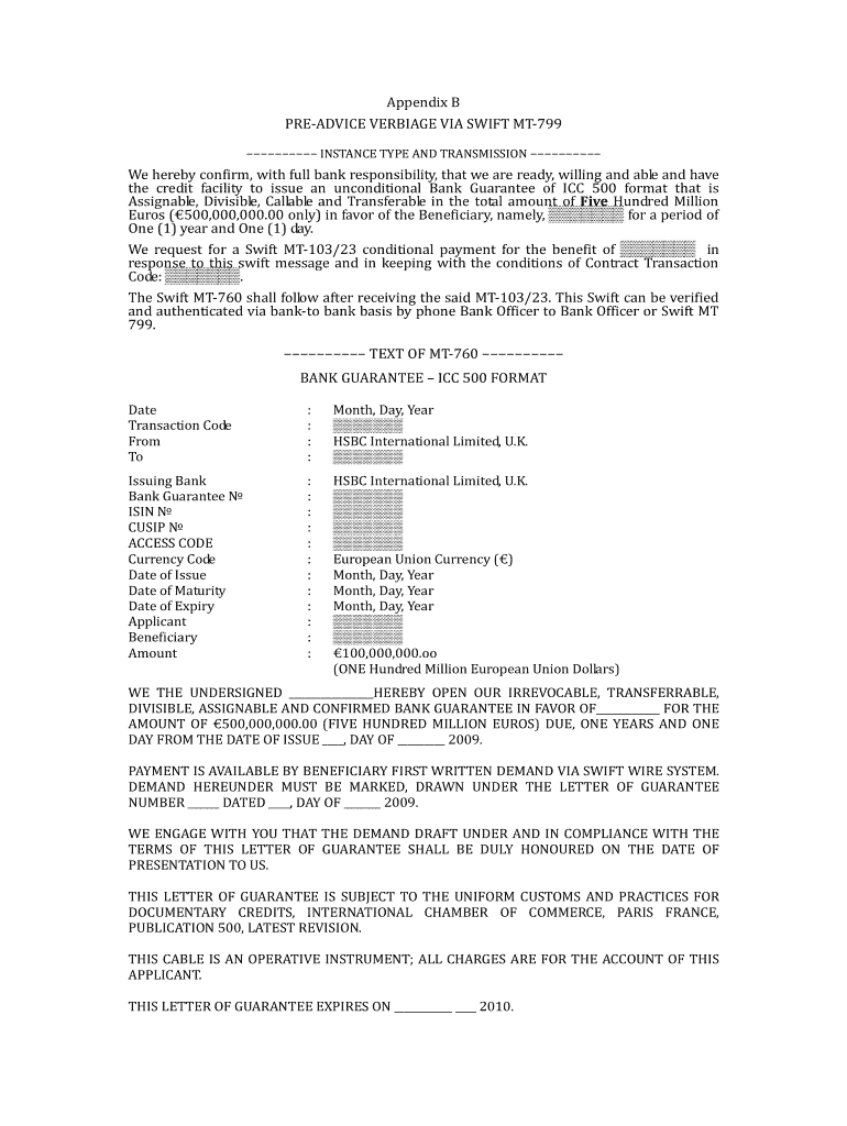 The Bank Guarantee ICC 500 Format is a specialized financial instrument issued by HSBC International Limited, UK. It serves as an unconditional guarantee for large transactions, often amounting to €500,000,000, providing security for both parties involved. This format adheres to the International Chamber of Commerce's Uniform Customs and Practices (UCP) 500 regulations, ensuring standardization and legal compliance in global finance.