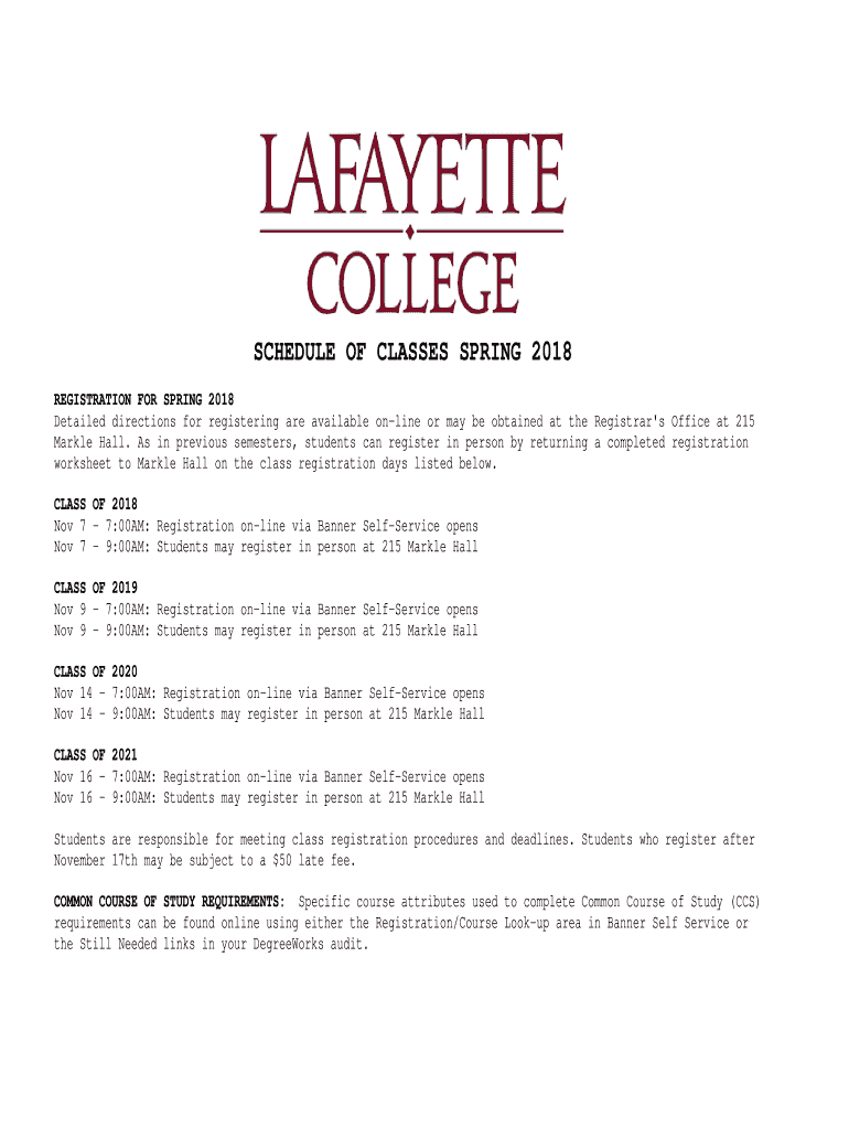 SCHEDULE OF CLASSES SPRING 2018 REGISTRATION FOR SPRING 2018 Detailed directions for registering are available online or may be obtained at the Registrar's Office at 215 Markle Hall. As in previous