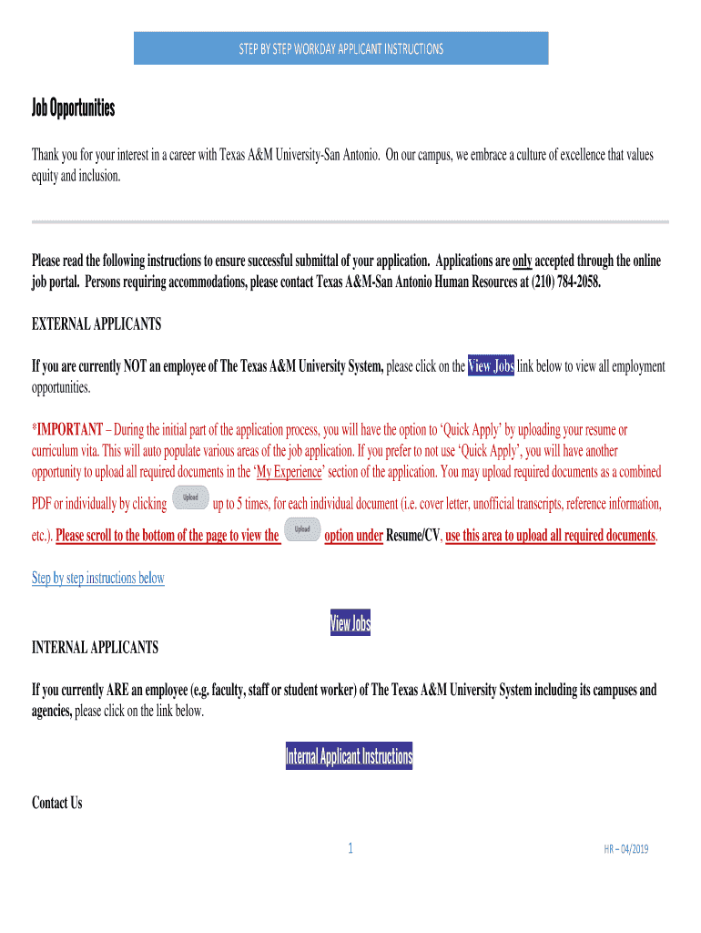 STEP BY STEP WORKDAY APPLICANT INSTRUCTIONS Job Opportunities Thank you for your interest in a career with Texas A&M University San Antonio. On our campus, we embrace a culture of excellence that