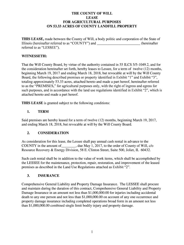 THE COUNTY OF WILL LEASE FOR AGRICULTURAL PURPOSES ON 53.33 ACRES OF COUNTY LANDFILL PROPERTYTHIS LEASE, made between the County of Will, a body politic and corporation of the State of Illinois (hereinafter