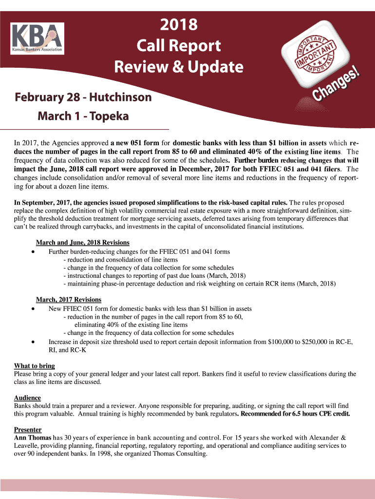 2018 Call Report Review & Update February 28 Hutchinson March 1 Topeka In 2017, the Agencies approved a new 051 form for domestic banks with less than $1 billion in assets which reduces the number