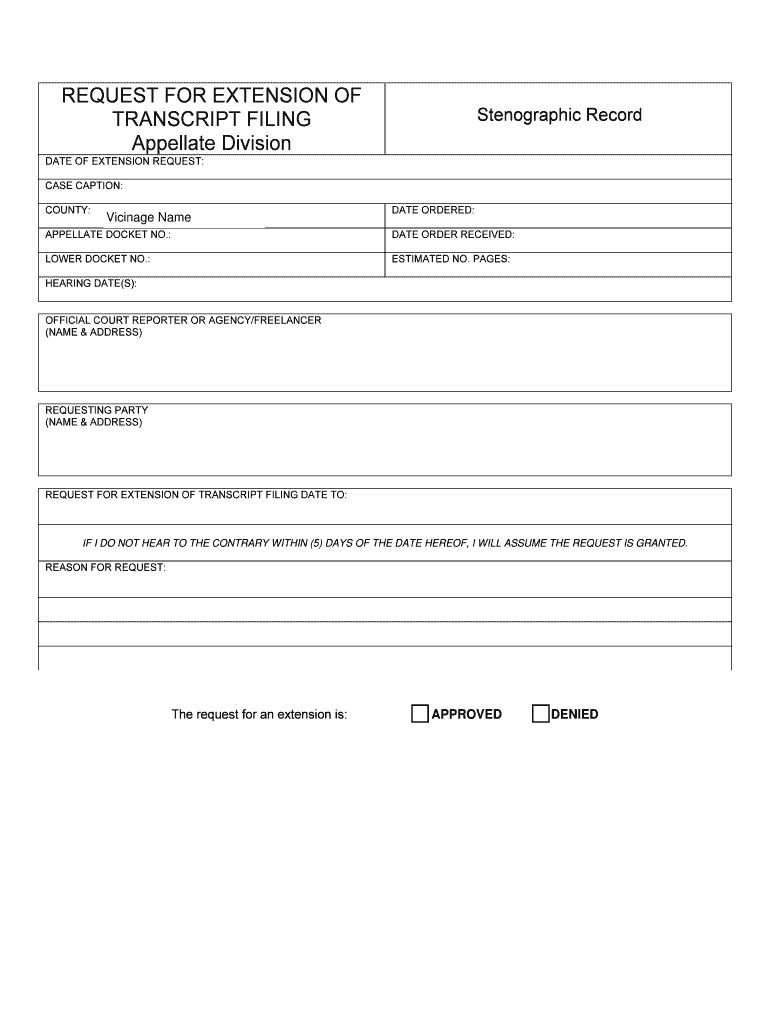 Essential information includes the case caption, county where the case is filed, docket numbers, and a valid reason for requesting an extension of the transcript filing. Ensure all fields are accurately filled.